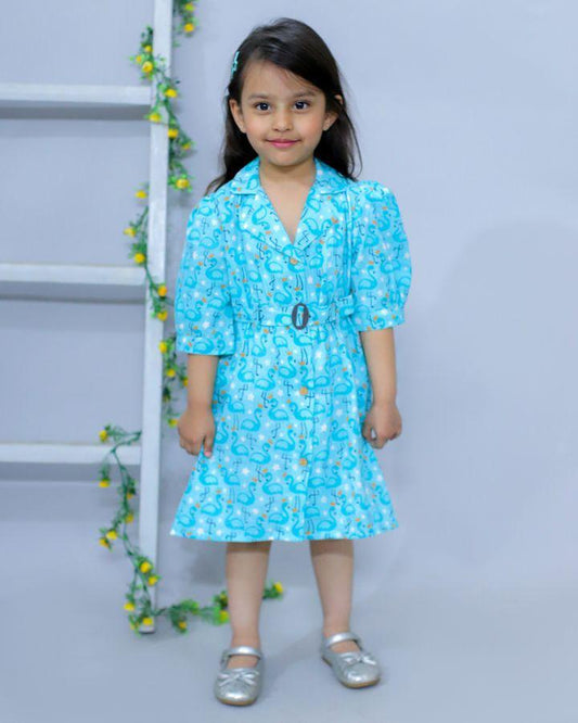 (SS-SS-1003) Lapel Collar Cotton Shirt Dress - Blue Flamingo print