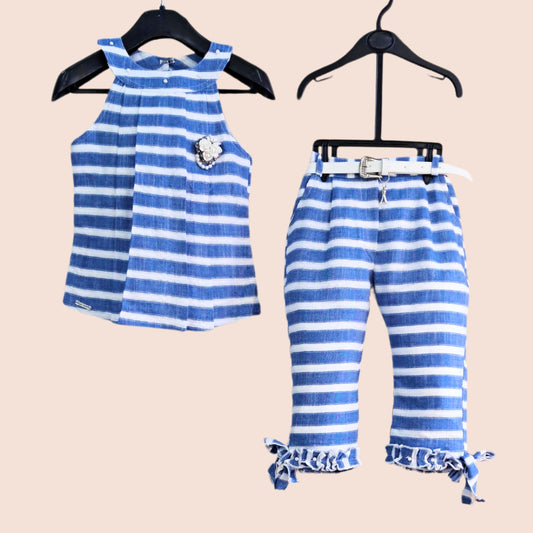 (RC-7763) Sleeveless Pleated and Frill Border Top with Matching Capri Jeans