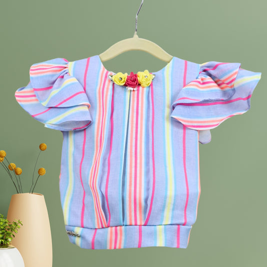 (RC-7749) Multi Color Frill Sleeve Striped Coord Set With Belt
