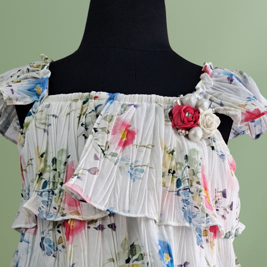 (RC-8854) White Three Layered Skirt and Cap Sleeves Top blooming with Pink and Blue Flower print