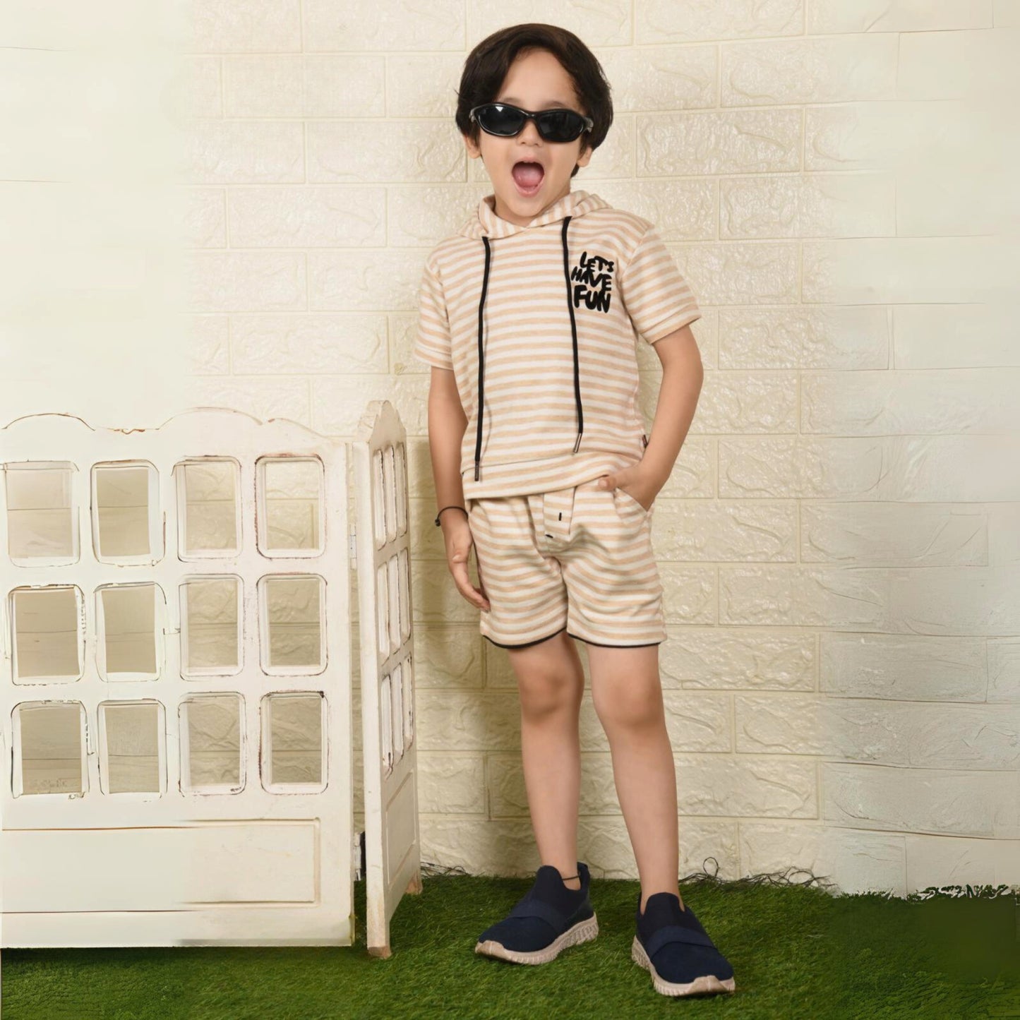 (RC-N-770) Beige and White Hooded Striped T-shirt Shorts Set