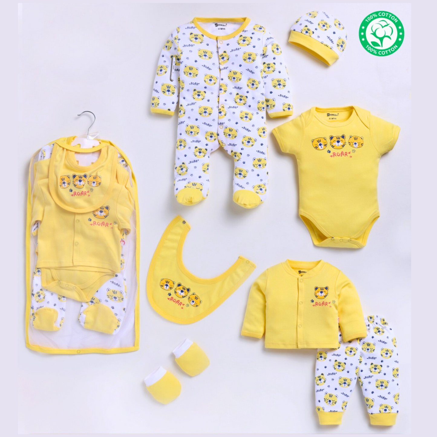 Items Included in the Package: 7 pc - 1 Romper, 1 Sleepsuit, 1 Shirt, 1 Pant, 1 Bib, 1 set Mittens, 1 Cap